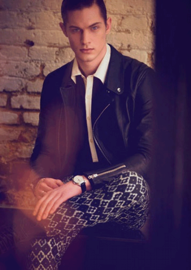 Model Greg Nawrat wearing a wardrobe of denim pieces from Valentino, Calvin Klein Collection, Dolce & Gabbana and others